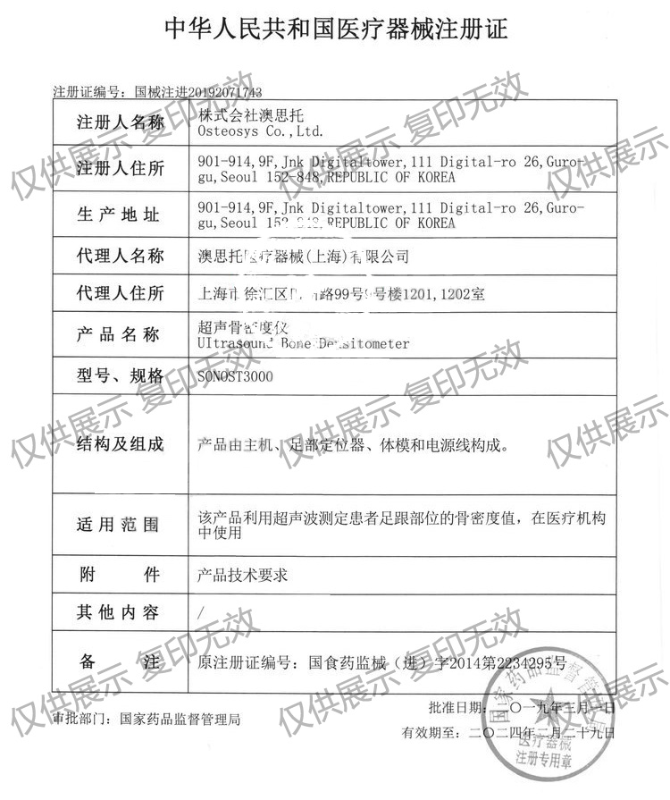 適用范圍:該產(chǎn)品利用超聲波測定患者足跟部位的骨密度值,在醫(yī)療機(jī)構(gòu)中使用。